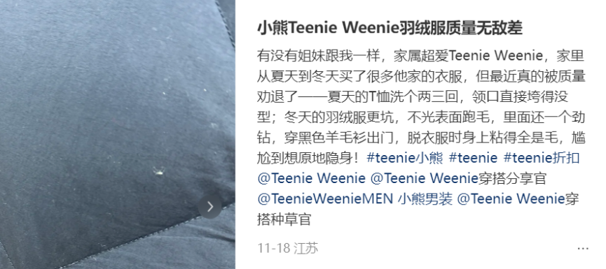 此外,在开启“南极人”模式授权贴牌后,Teenie Weenie的产品质量下滑似乎也成了许多消费者的一致反馈。